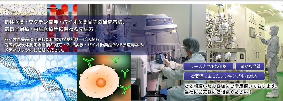 メディリッジ株式会社は「より良い医療や健康な生活の実現(QOL向上)のため皆様と共に歩みます。」をコンセプトに、従来のバイオ基礎技術を柱として、バイオ医薬品や遺伝子治療、再生医療などの分野に従事する研究者、医師へのサービス提供に向けて、研究開発から前臨床および臨床試験、臨床治験までコンサルティングも含めてワンストップでサービスをご提供します。